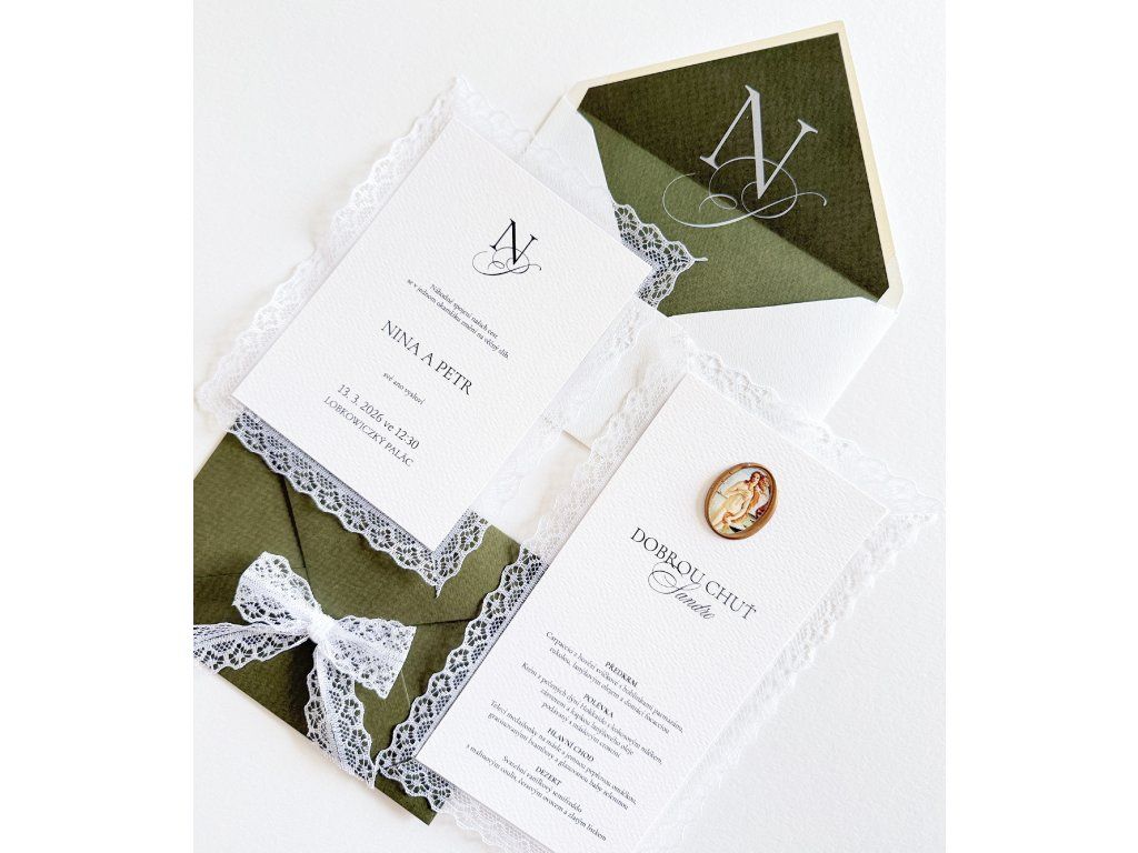 Tento svatební set je navržen v romantickém a nadčasovém stylu, který kombinuje jemnou krajku, kvalitní strukturovaný papír a přírodní barevnou paletu. Dominantním prvkem je dekorativní krajkové lemování, které dodává celé kolekci něžný a luxusní vzhled.