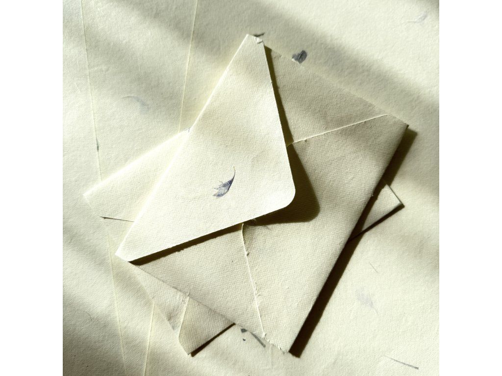 Bavlněný ruční papír, gramáž cca 180 g/m2 s vlisovanými modrými okvětními lístky.